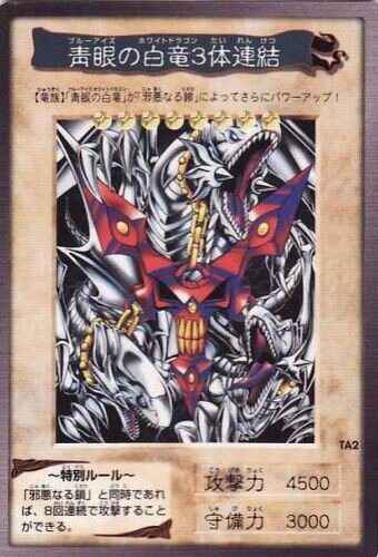Na Terceira Geração, também tínhamos o "Conexão de 3 Corpos de Dragão Branco de Olhos Azuis" na forma jumbo. Ele era formado por 4 cartas, que eram obtíveis por "rolar o gacha de 4 cartas" por 100 ienes (O que daria uns R$ 5,50 ou 6,50 considerando a inflação entre 1998 e agora).